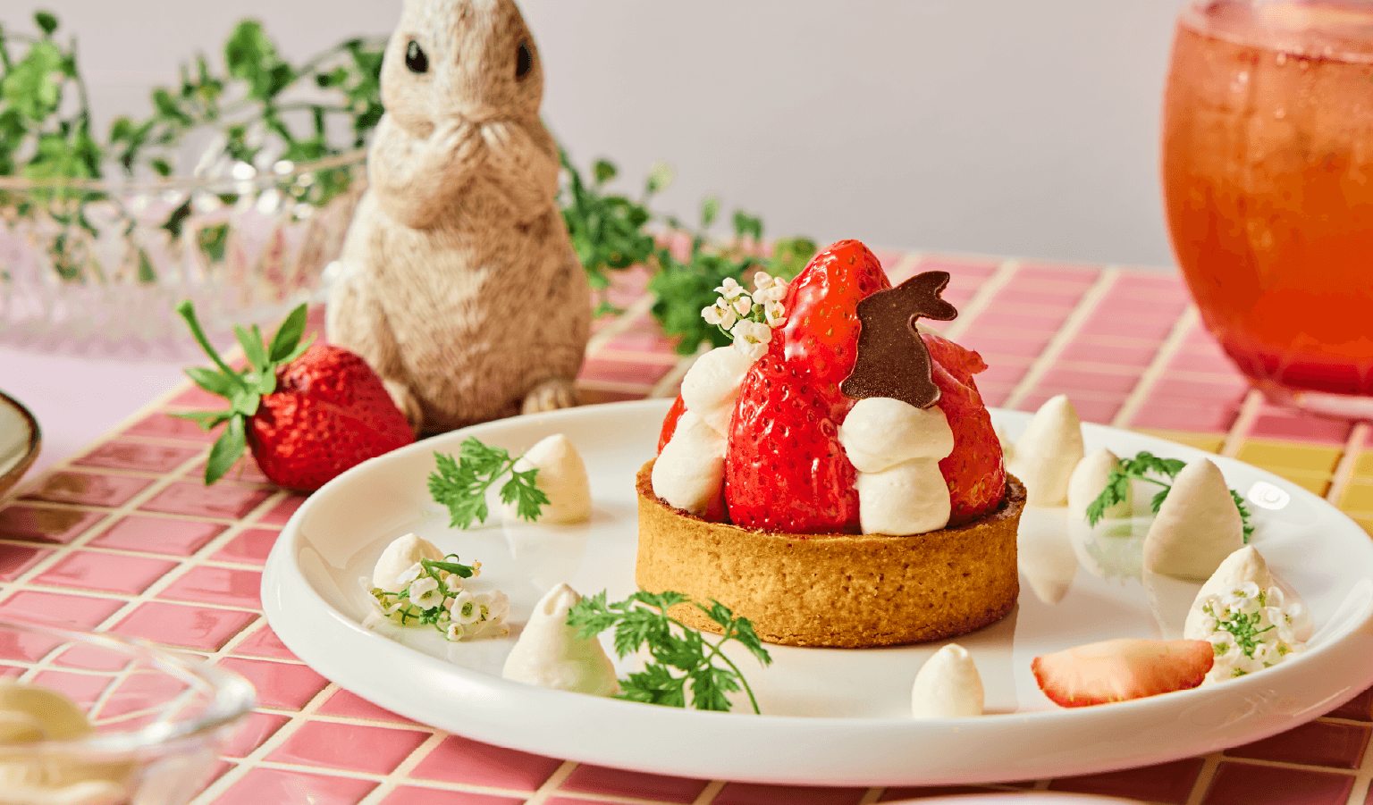 ・イースターガーデンストロベリータルト:王道のストロベリータルトに、愛らしいイースターバニーをデコレーションした繊細でクラシカルなスイーツ。さくさくのタルト生地にアーモンドクリームを流し込み、滑らかなカスタードクリームとたっぷりのいちごを載せました。お皿に飾っているエディブルフラワーと生クリームはガーデンを彷彿とさせ、庭でエッグハントをしている子うさぎを再現した、イースターならではの一皿です。