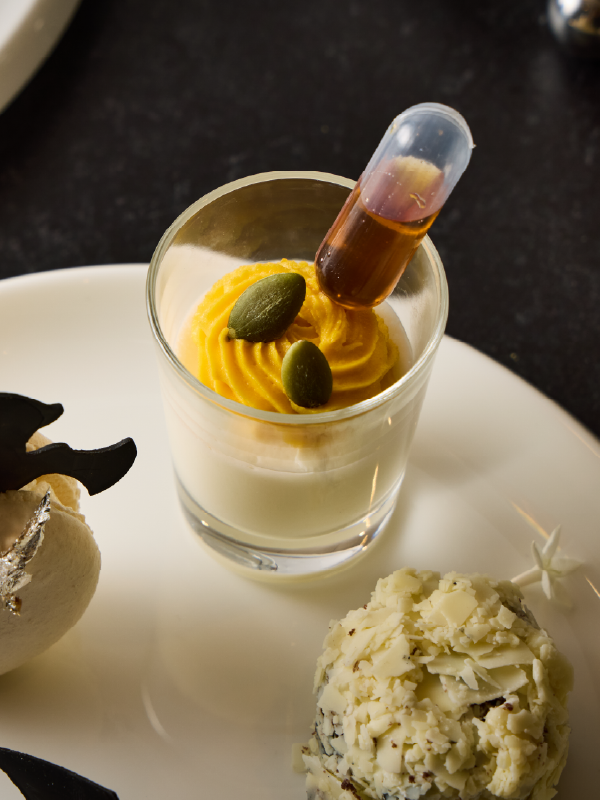 ・メープルパンプキンパンナコッタ:パンプキンクリームを乗せたグラスデザート。お好みでメープルシロップをかけてお召し上がりください。
