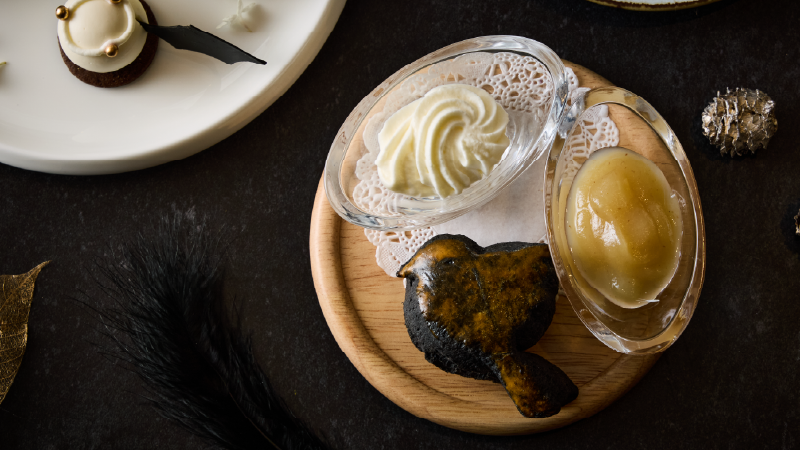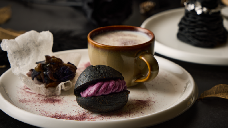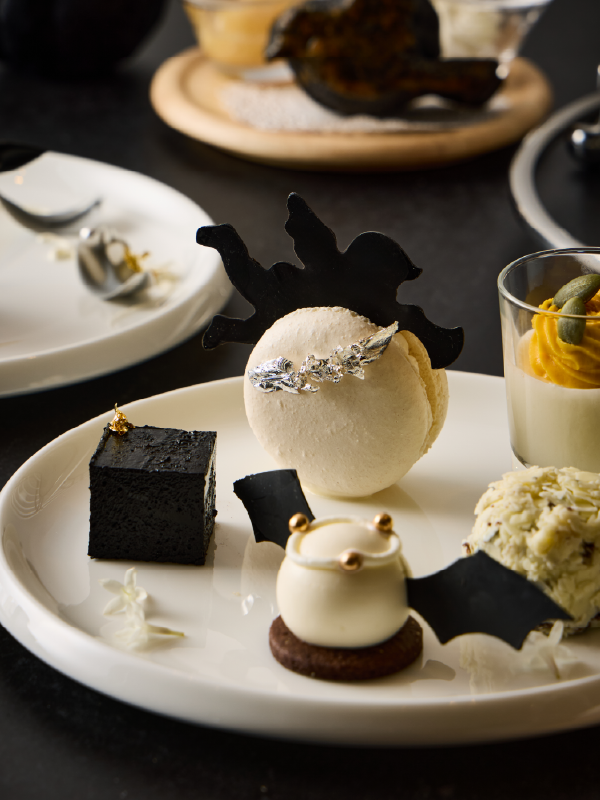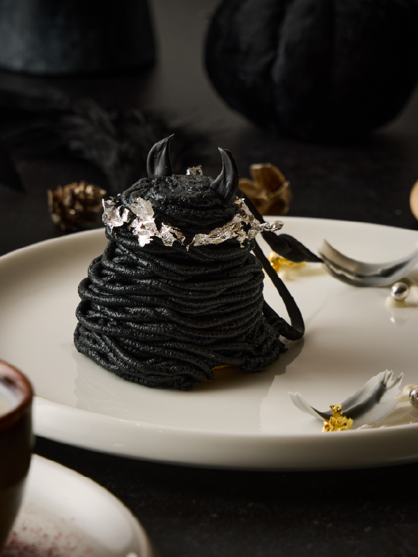 柔らかな雰囲気のオータムから一変し、天使たちがデビルに姿を変えたような、少し怪しげで遊び心満載のアフタヌーンティーに。黒胡麻餡のモンブラン「ブラックモンスター・モンブラン」をはじめ、セイボリーやドリンクもハロウィン仕様で、ミステリアスな世界観を心ゆくまでお楽しみください。