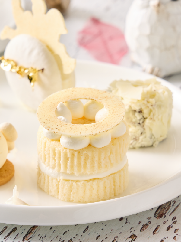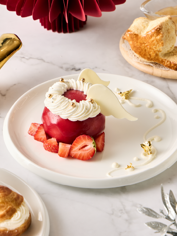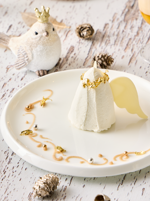・エンジェルベリー・ムース:ミックスベリーの果肉とジュレが入ったバニラムースを、艶やかなラズベリーグラサージュでコーティングしました。クリスマスを象徴するような鮮やかな赤が目を引く一品です。天使の輪と羽をあしらい、心弾むような味わいをお楽しみいただけます。