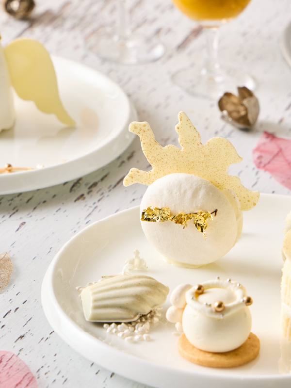 ・エンジェルマカロン:天使の形のホワイトチョコレートと金箔で華やかに飾った、安納芋クリームのマカロン。