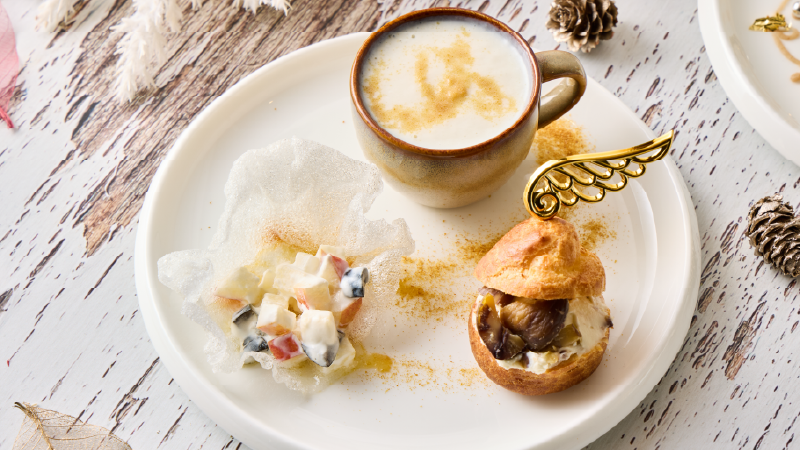 秋の深まりを感じさせる、繊細なスイーツが並びます。主役の「ホワイトエンジェル・モンテビアンコ」は、天使の形をあしらい、栗の芳醇な香りが魅力の絶品秋スイーツ。秋らしい温かみのあるセイボリーと特製ドリンクとともに、心安らぐ時間をお楽しみください。