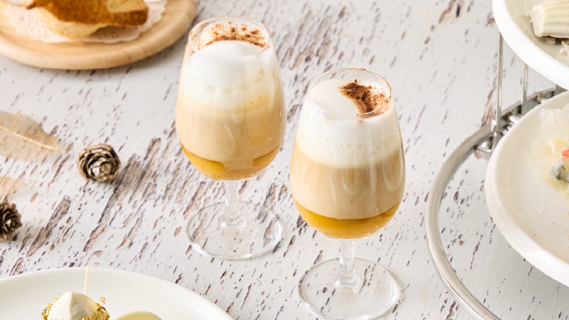 ・パンプキンマキアート:フルーティーなコーヒーをベースに、かぼちゃ優しい甘さを加えたホットドリンクです。ふんわりと泡立てたミルクの白が、まるで雲のようにグラスを彩ります。心温まる一杯で、アフタヌーンティーのひとときをより豊かにお過ごしください。