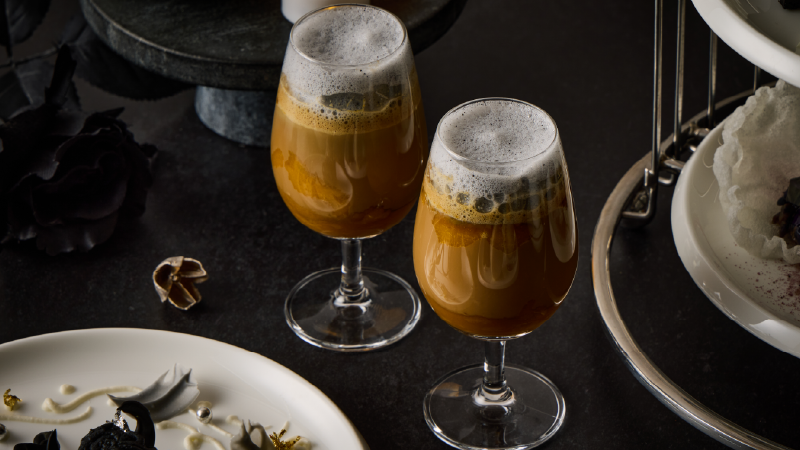 ・チャコールパンプキンマキアート:フルーティーなコーヒーをベースに、かぼちゃの優しい甘さを加えたホットドリンクです。ふんわりと泡立てたミルクに竹炭のパウダーを混ぜ込み、雨雲のような雰囲気を醸し出す。ハロウィンの面白おかしいアフタヌーンティーをより完成度を高めた一品です。