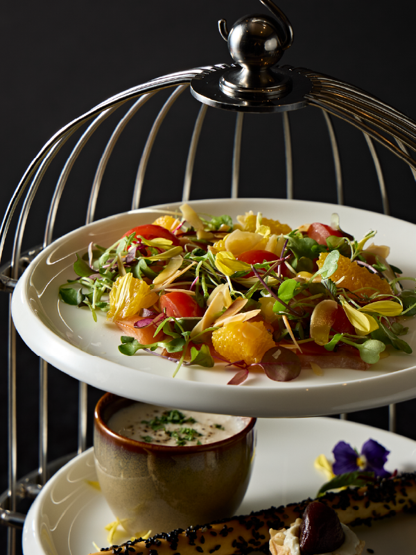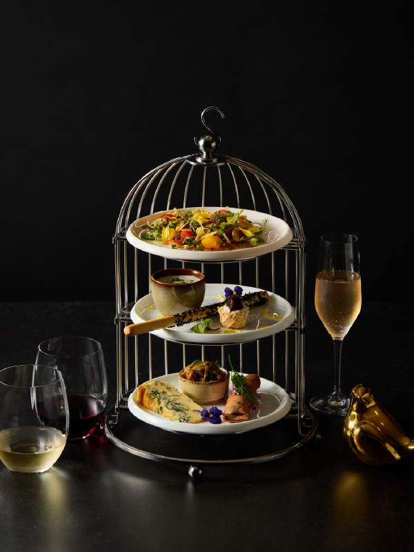 鳥かごをモチーフにしたスタンドに、シェフ特製のアンティパストをご用意しました。