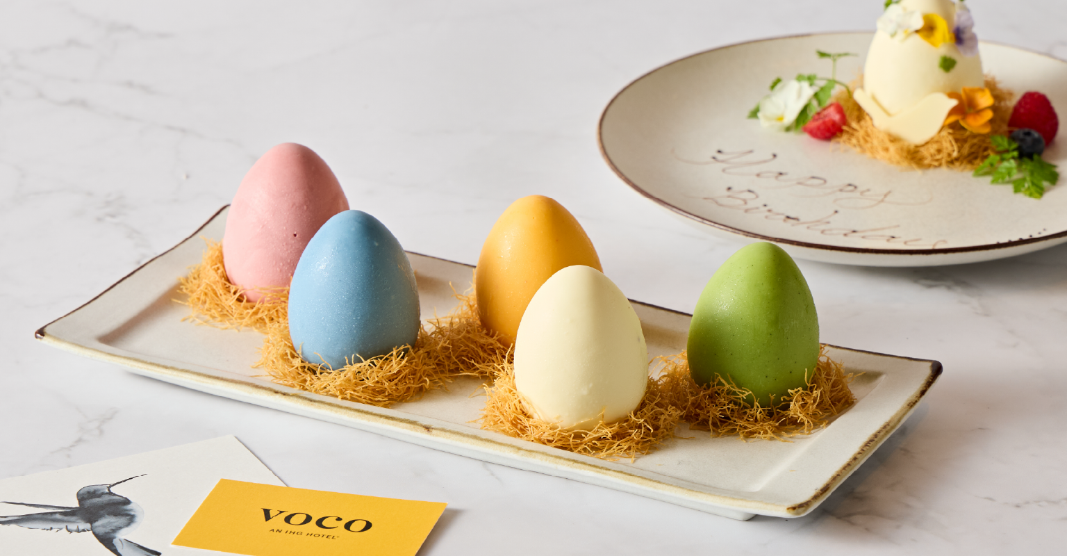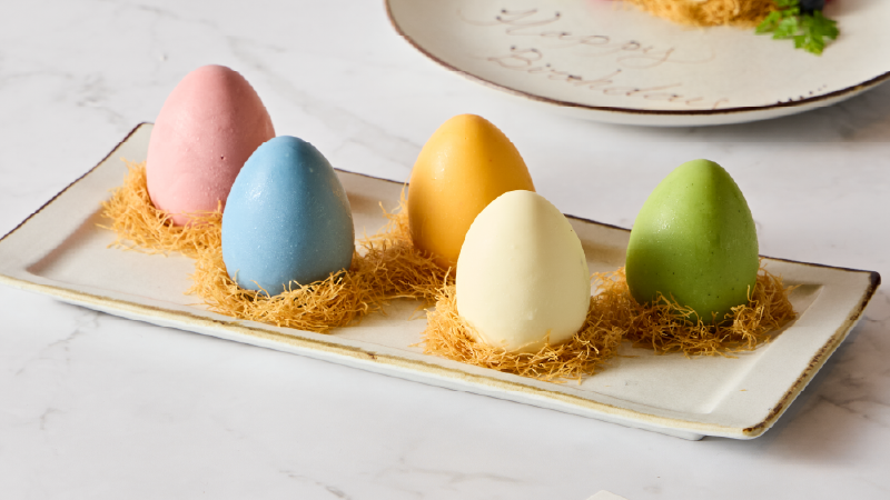 ホワイト、ブルー、イエローオレンジ、ピンク、グリーン。まるで宝石のようにカラフルな5色から選べる、エッグ型スイーツをプレートとしてご提供いたします。