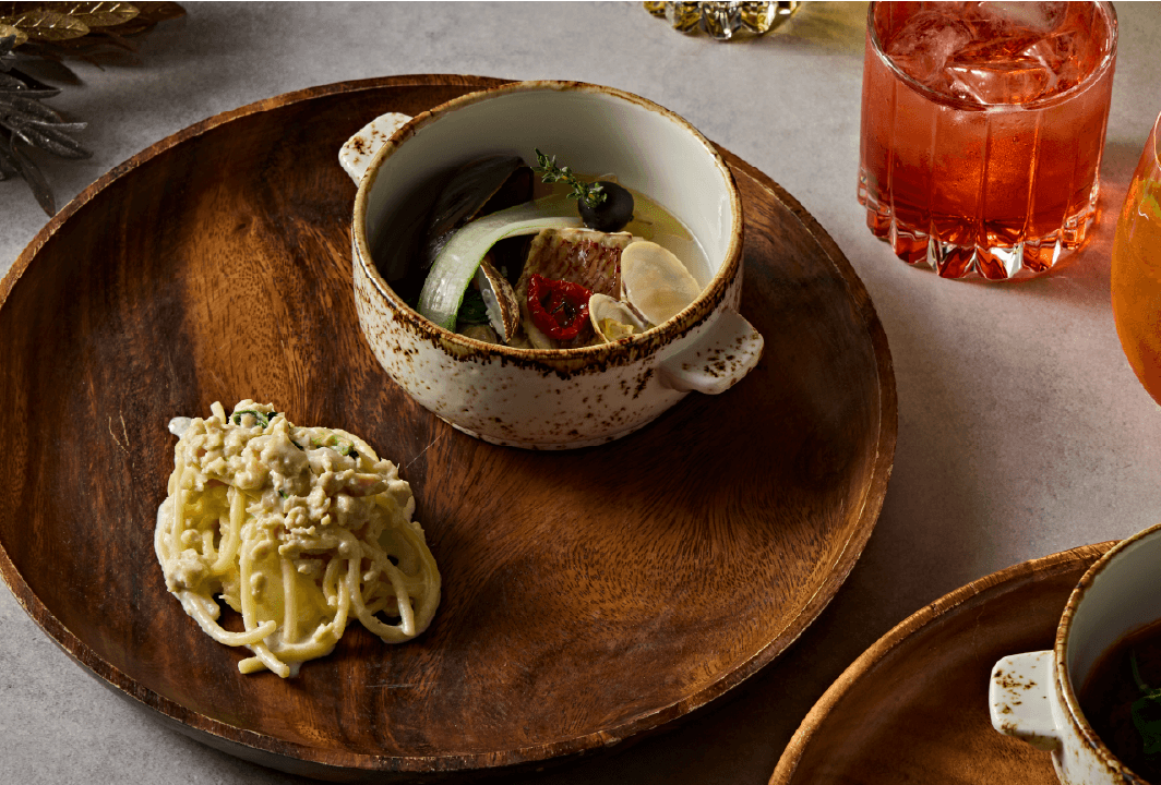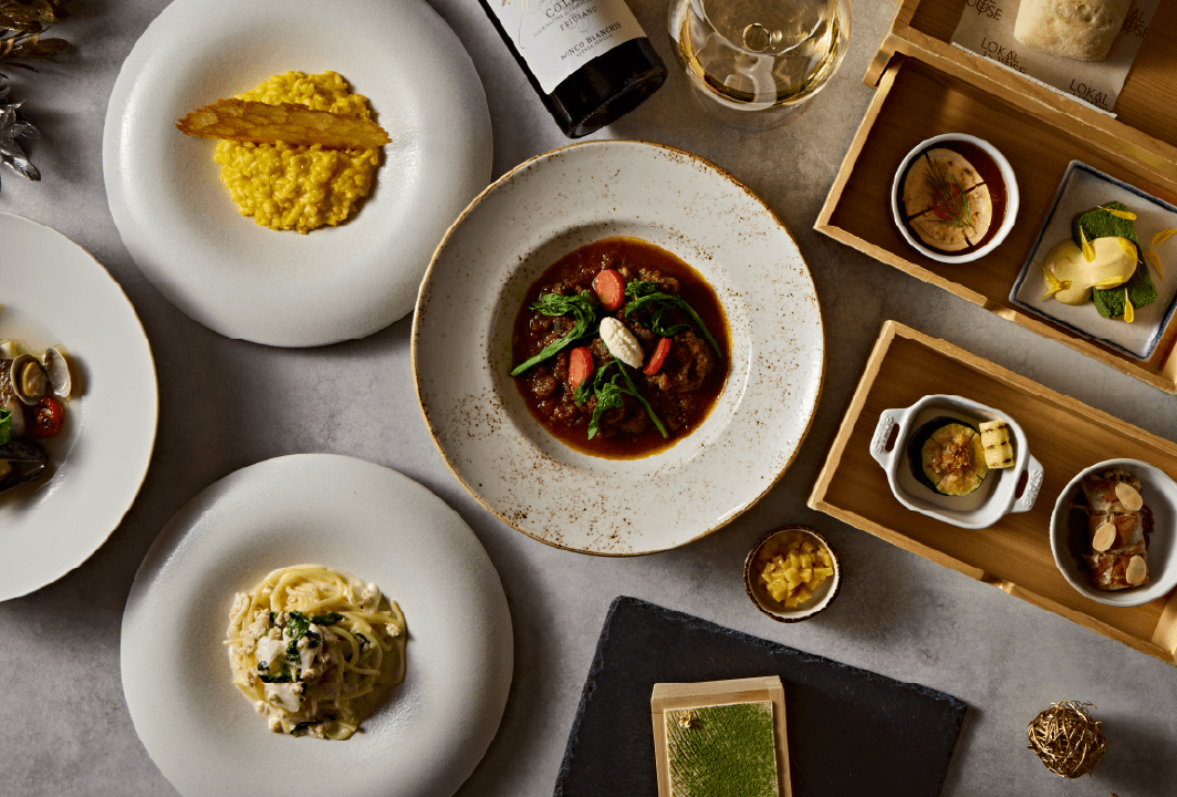 迫力のあるオープンキッチンでつくられる、こだわりの一皿。 ライブキッチンで仕上げる生パスタ1品付きの、22種の鮮やかな前菜とデザートが揃えるライトビュッフェをお楽しみいただけます。
