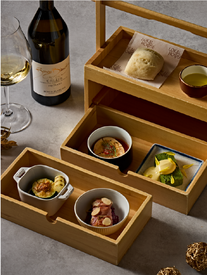 「LOKAL HOUSE」と「CASUAL」2コース共通でご提供するのは、日本の伝統的な美しさを宿す檜の岡持弁当箱に美しく盛り付けられた4種の前菜。蓋を開けた瞬間に広がる香りと、色とりどりの旬の食材が織りなすハーモニーは、まるでイタリアと日本の季節を感じさせる食の宝石箱。