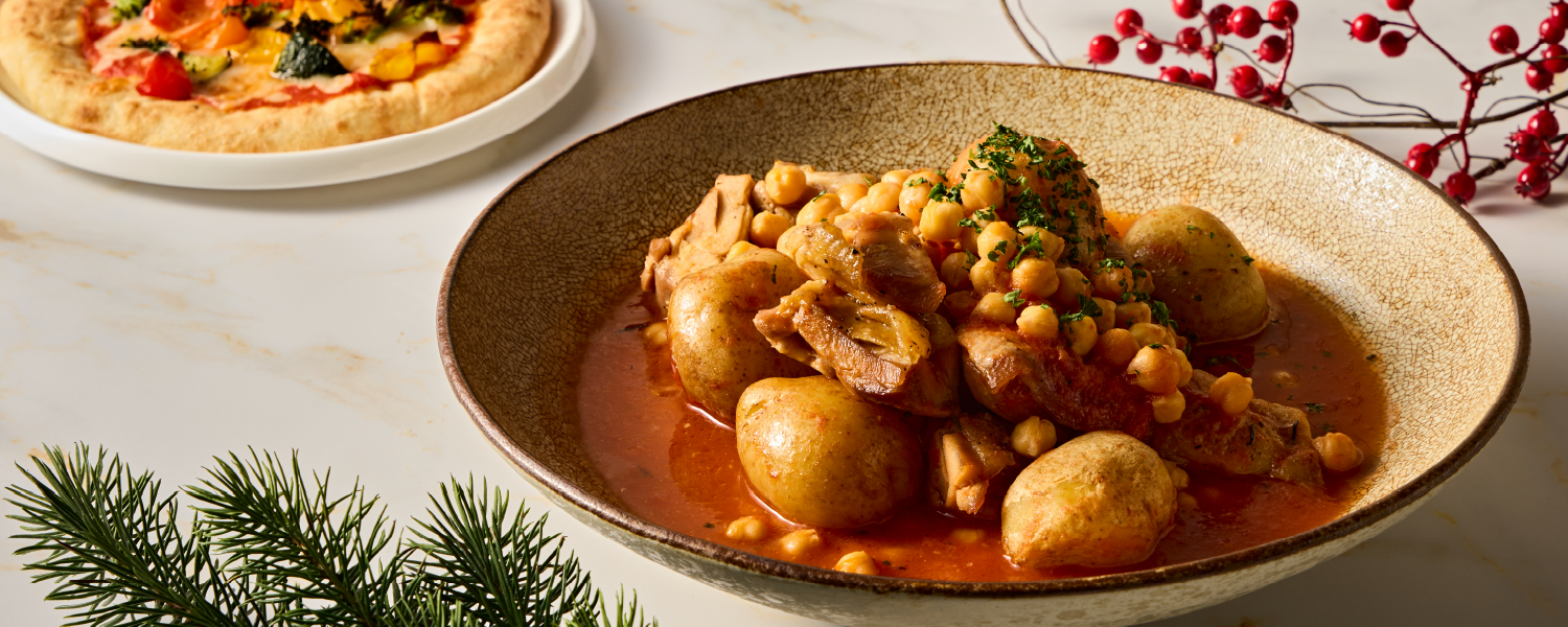 ほろほろと柔らかく煮込んだ鶏肉に、ホクホクとしたひよこ豆の食感をプラス。野菜の甘みとトマトの酸味が調和した、心も体も温まる優しい味わいの煮込み料理です。