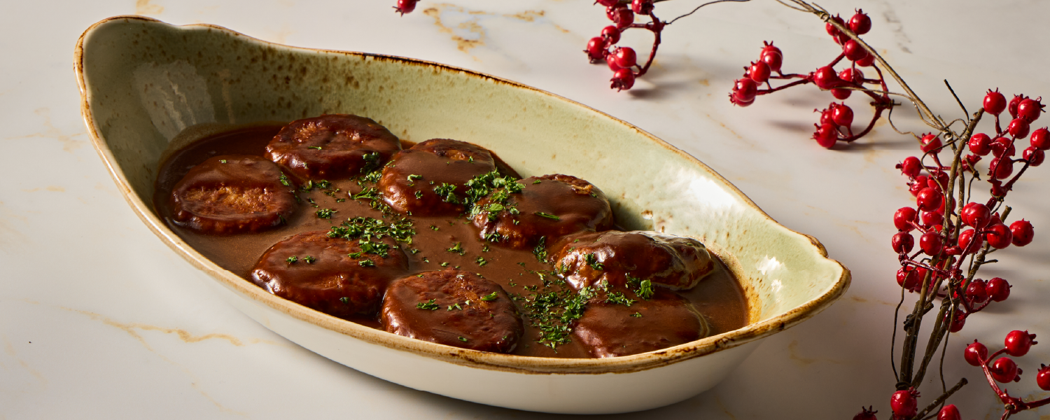 ジューシーなハンバーグを、コク深いデミグラスソースで丁寧に煮込みました。濃厚なソースが絡む、冬の温もりを感じる一品です。
