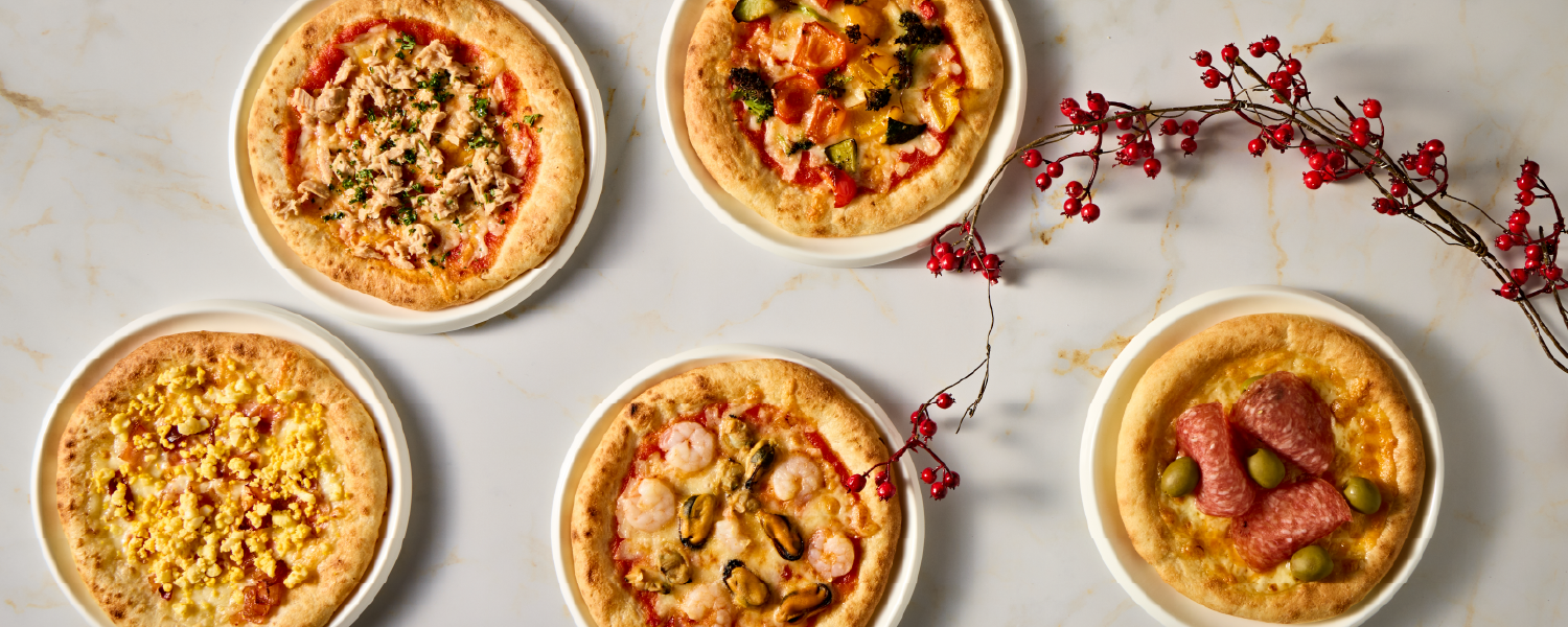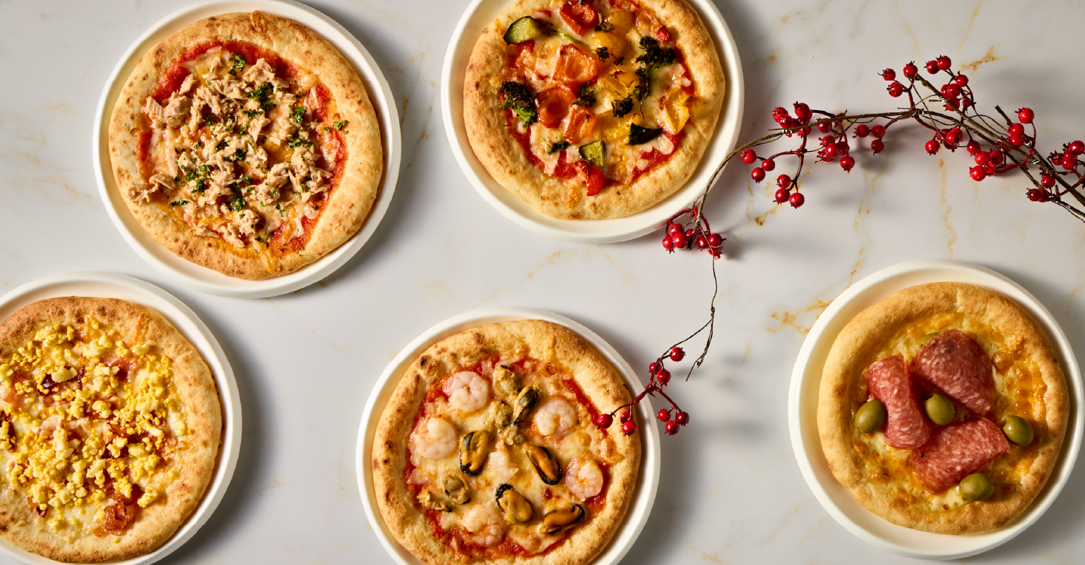 楽しさ満点の「マイ・ピザ」コーナー。ベーコン、エビ、サラミなどの豊富な具材から、お好みのトッピングとソースを選び、ご自身でカスタマイズできます。自分だけのオリジナルピザを、焼き立てでお楽しみください。